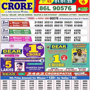 RESULT DEAR DWARKA MONDAY WEEKLY LOTTERY 20.01.2025