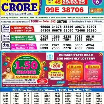 RESULT PUNJAB STATE DEAR 10 MERCURY SATURDAY WEEKLY LOTTERY 29.03.2025