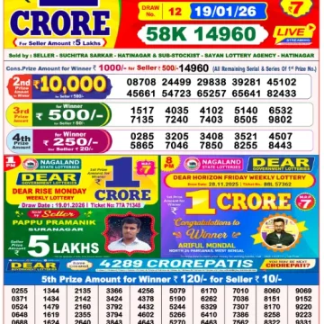 RESULT DEAR RISE MONDAY WEEKLY LOTTERY 19.01.2026