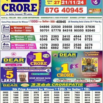 RESULT DEAR 100 GANGA THURSDAY WEEKLY LOTTERY 21.11.2024