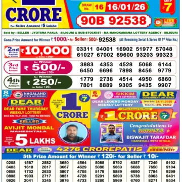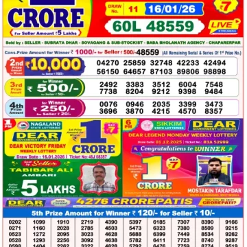 RESULT DEAR CROWN FRIDAY WEEKLY LOTTERY 16.01.2026