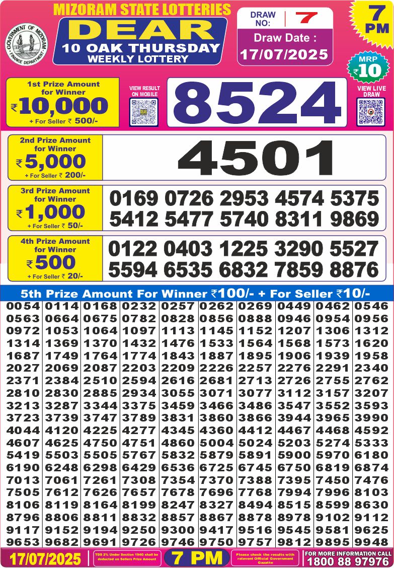 RESULT DEAR 10 OAK THURSDAY WEEKLY LOTTERY 17.07.2025 Leave a Comment on RESULT DEAR 10 OAK THURSDAY WEEKLY LOTTERY 17.07.2025 Share: XFacebookPinterestRedditVKDiggLinkedinMix