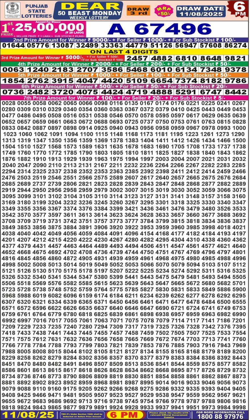 RESULT DEAR 50 BEAST MONDAY WEEKLY LOTTERY 11.08.2025 Leave a Comment on RESULT DEAR 50 BEAST MONDAY WEEKLY LOTTERY 11.08.2025 Share: XFacebookPinterestRedditVKDiggLinkedinMix