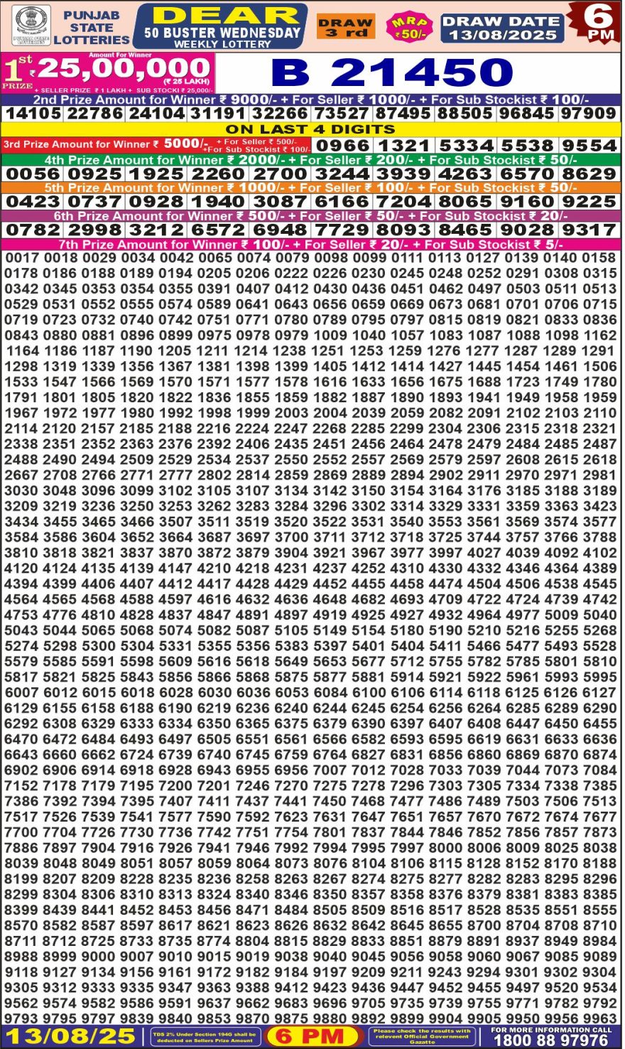 RESULT DEAR 50 BUSTER WEDNESDAY WEEKLY LOTTERY 13.08.2025 Leave a Comment on RESULT DEAR 50 BUSTER WEDNESDAY WEEKLY LOTTERY 13.08.2025 Share: XFacebookPinterestRedditVKDiggLinkedinMix