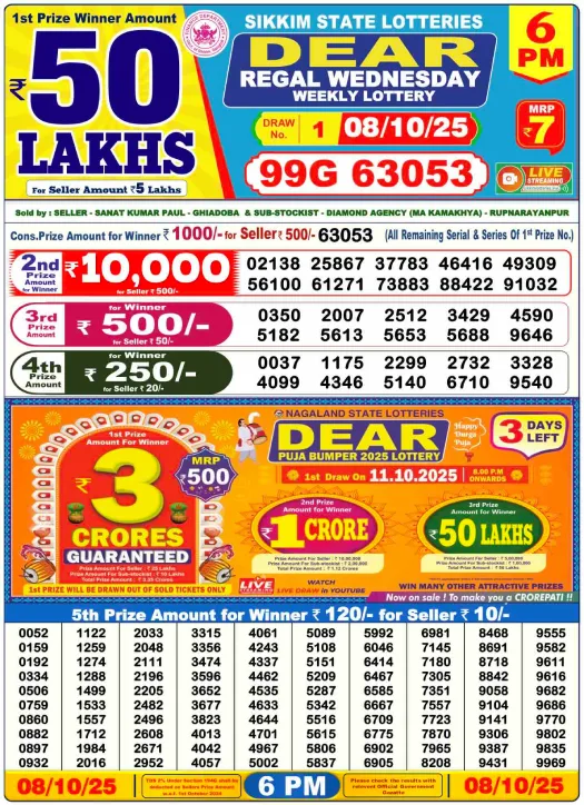 RESULT DEAR REGAL WEDNESDAY WEEKLY LOTTERY 08.10.2025 Leave a Comment on RESULT DEAR REGAL WEDNESDAY WEEKLY LOTTERY 08.10.2025 Share: XFacebookPinterestRedditVKDiggLinkedinMix