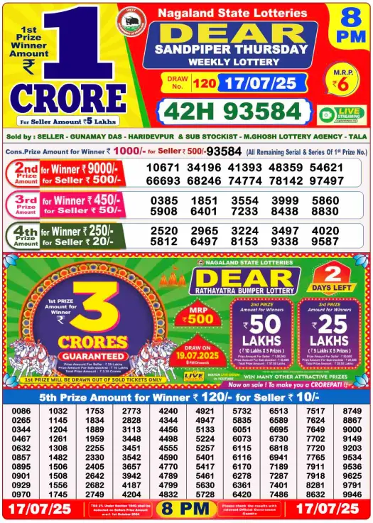 RESULT DEAR SANPIPER THURSDAY WEEKLY LOTTERY 17.07.2025 Leave a Comment on RESULT DEAR SANPIPER THURSDAY WEEKLY LOTTERY 17.07.2025 Share: XFacebookPinterestRedditVKDiggLinkedinMix