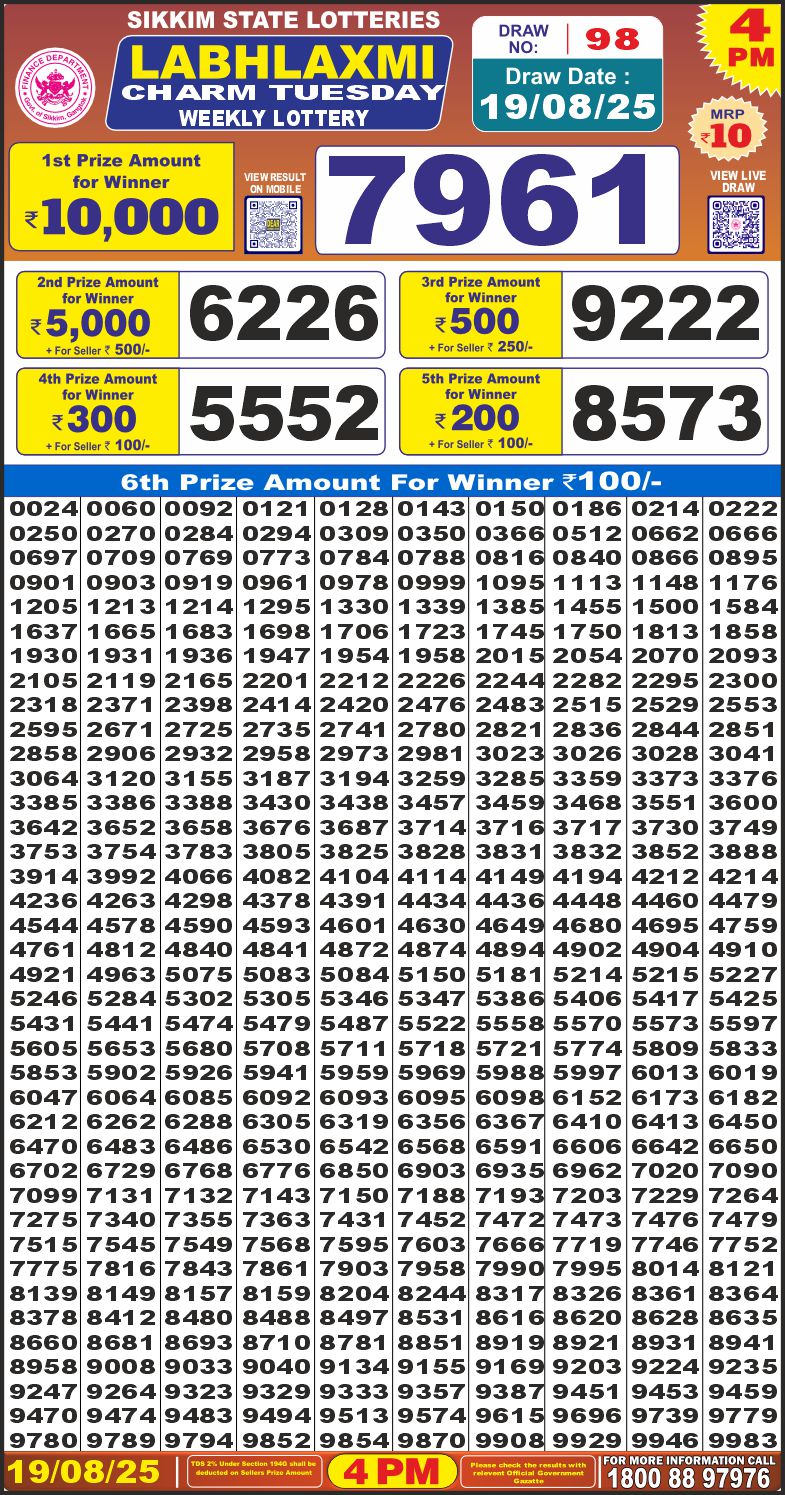 RESULT LABHLAXMI CHARM TUESDAY WEEKLY LOTTERY 19.08.2025 Leave a Comment on RESULT LABHLAXMI CHARM TUESDAY WEEKLY LOTTERY 19.08.2025 Share: XFacebookPinterestRedditVKDiggLinkedinMix