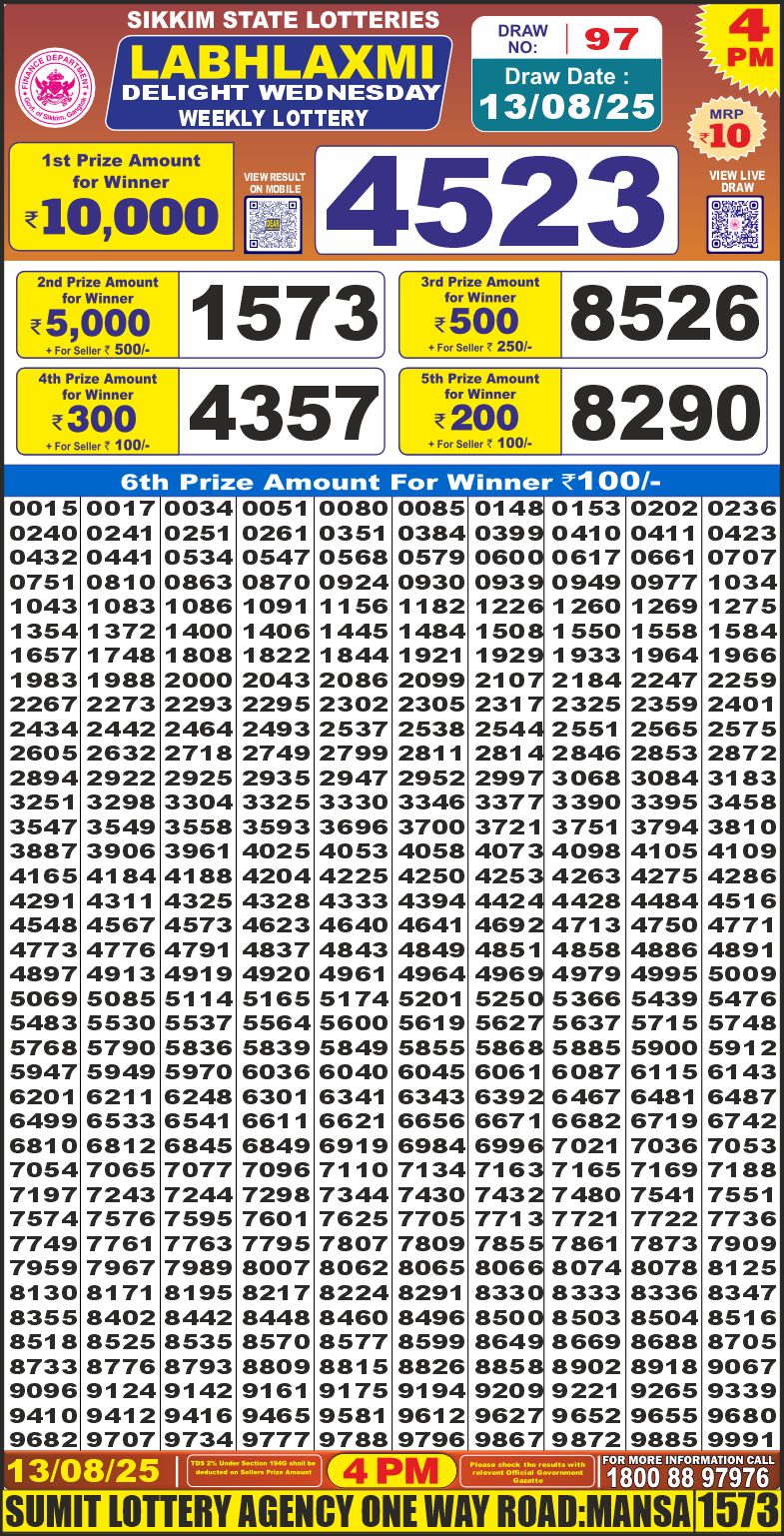 RESULT LABHLAXMI DELIGHT WEDNESDAY WEEKLY LOTTERY 13.08.2025 Leave a Comment on RESULT LABHLAXMI DELIGHT WEDNESDAY WEEKLY LOTTERY 13.08.2025 Share: XFacebookPinterestRedditVKDiggLinkedinMix