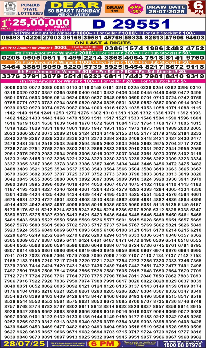 RESULT PUNJAB DEAR 50 WEEKLY LOTTERY DRAW DATE 28.07.2025 Leave a Comment on RESULT PUNJAB DEAR 50 WEEKLY LOTTERY DRAW DATE 28.07.2025 Share: XFacebookPinterestRedditVKDiggLinkedinMix