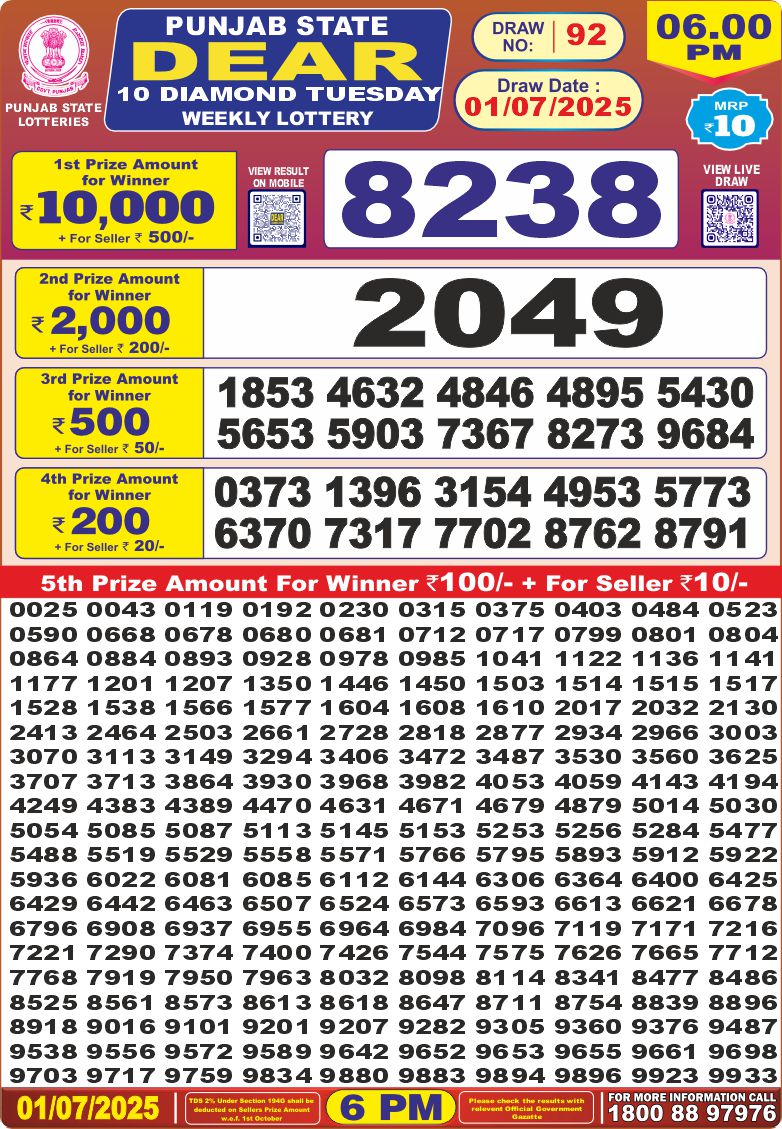 RESULT PUNJAB STATE DEAR 10 DIAMOND TUESDAY WEEKLY LOTTERY 01.07.2025 Leave a Comment on RESULT PUNJAB STATE DEAR 10 DIAMOND TUESDAY WEEKLY LOTTERY 01.07.2025 Share: XFacebookPinterestRedditVKDiggLinkedinMix