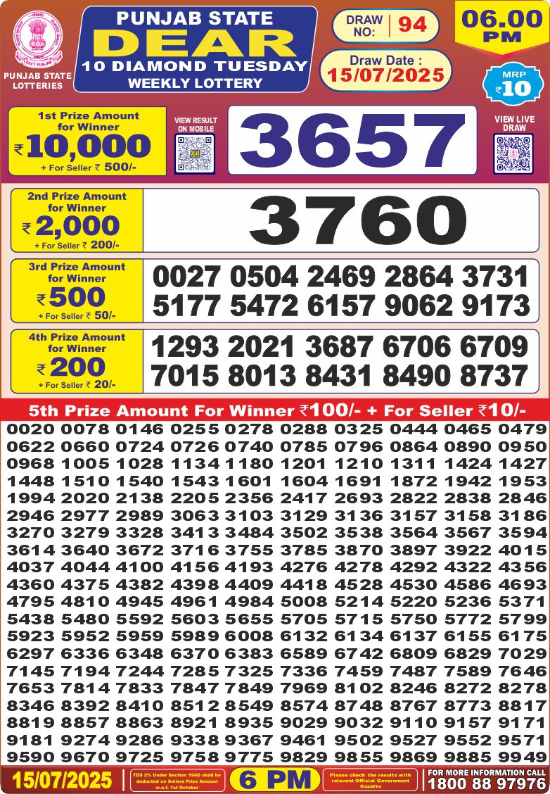 RESULT PUNJAB STATE DEAR 10 DIAMOND TUESDAY WEEKLY LOTTERY 15.07.2025 Leave a Comment on RESULT PUNJAB STATE DEAR 10 DIAMOND TUESDAY WEEKLY LOTTERY 15.07.2025 Share: XFacebookPinterestRedditVKDiggLinkedinMix