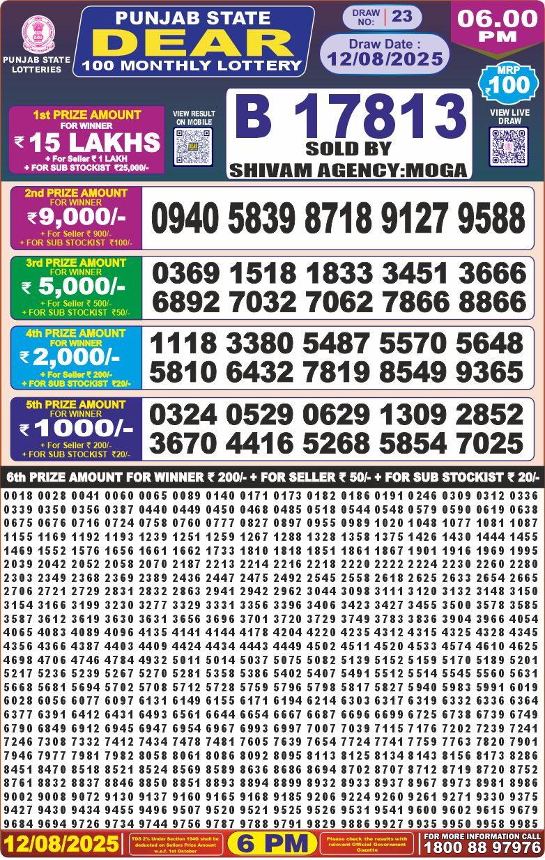 RESULT PUNJAB STATE DEAR 100 MONTHLY LOTTERY 12.08.2025 Leave a Comment on RESULT PUNJAB STATE DEAR 100 MONTHLY LOTTERY 12.08.2025 Share: XFacebookPinterestRedditVKDiggLinkedinMix
