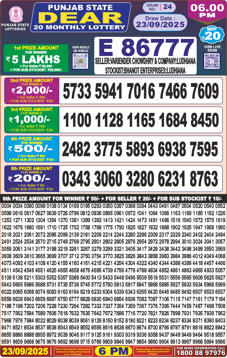 RESULT PUNJAB STATE DEAR 20 MONTHLY LOTTERY 23.09.2025 Leave a Comment on RESULT PUNJAB STATE DEAR 20 MONTHLY LOTTERY 23.09.2025 Share: XFacebookPinterestRedditVKDiggLinkedinMix