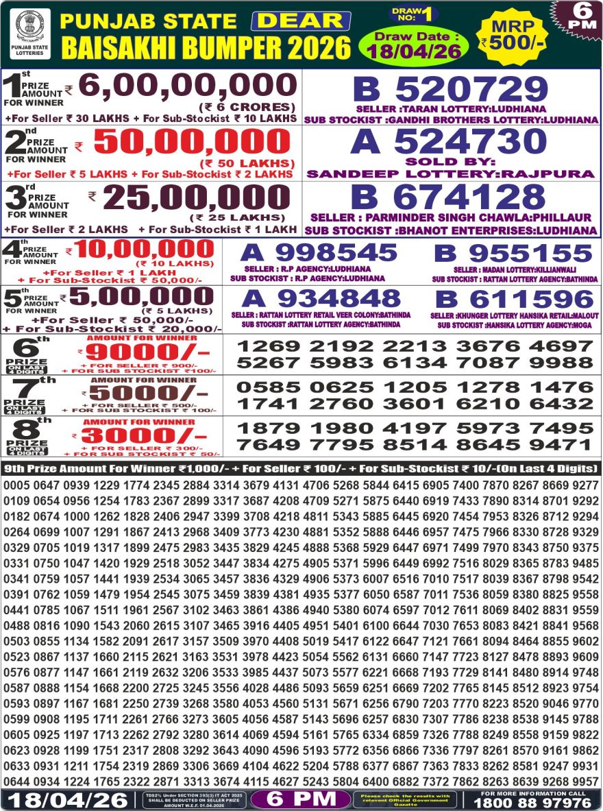 RESULT PUNJAB STATE DEAR BAISAKHI BUMPER 18.04.2026 Leave a Comment on RESULT PUNJAB STATE DEAR BAISAKHI BUMPER 18.04.2026 Share: XFacebookPinterestRedditVKDiggLinkedinMix